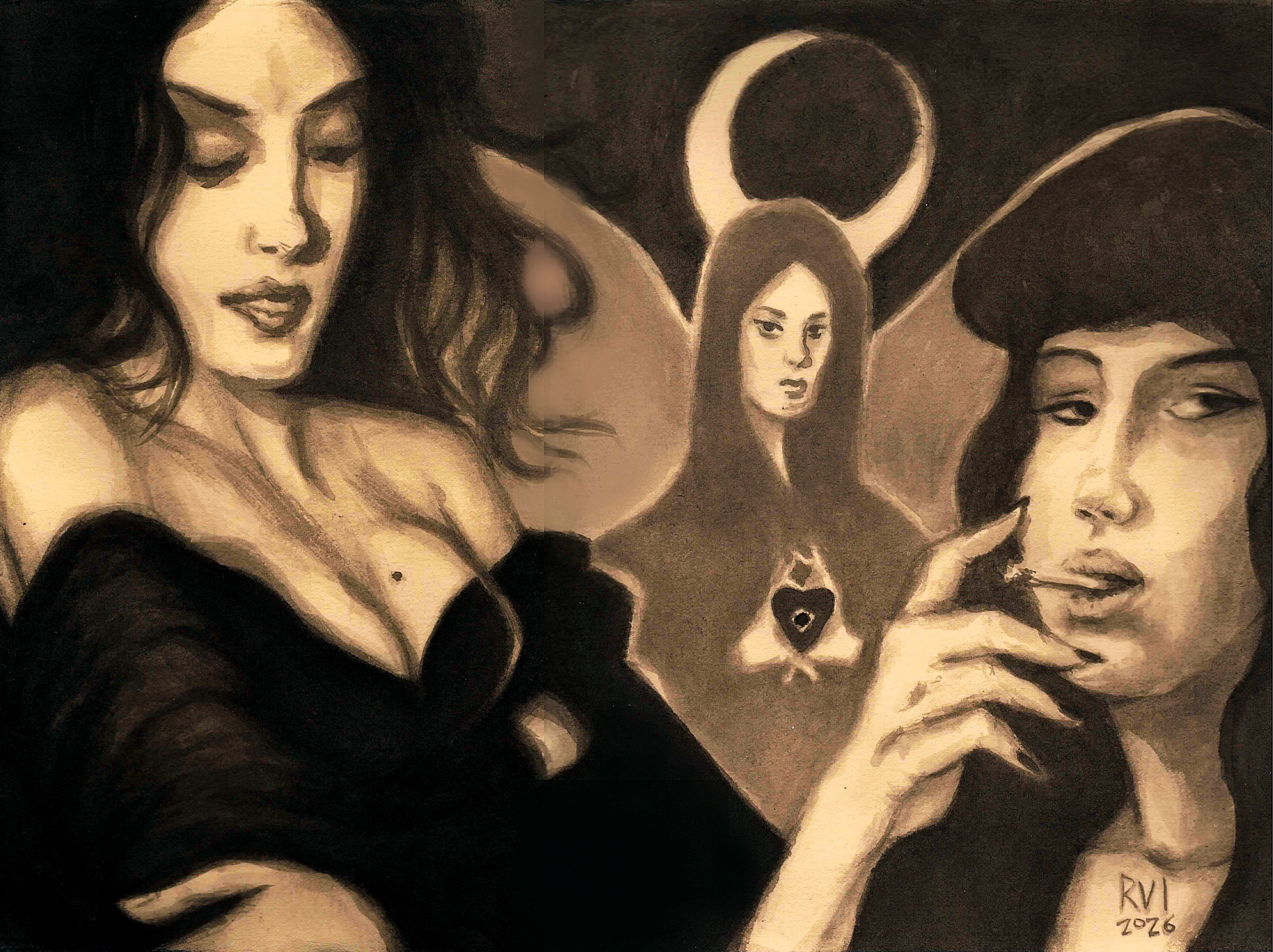 “Mystery Play,” 11” x 15.5”, brush and ink wash on buff colored Arches Rives BFK; May-June 2025 Richard Van Ingram. [Yes, I know I wrote ‘2026’ by accident at the time, but we all know better. Sorry.]